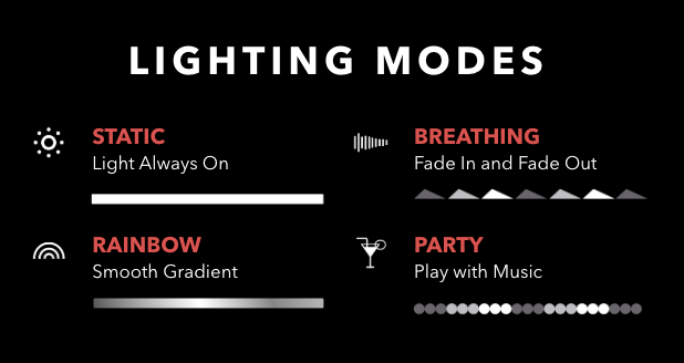 Ambient Light System™ with four LED modes: Static (always on), Breathing (fade in/out), Rainbow (smooth gradient), and Party (music-reactive)